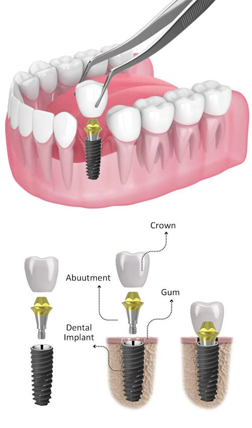 Dental implant is a permanent solution for tooth loss, designed to replicate a natural tooth from root to crown. The process involves surgically embedding a biocompatible titanium post into the jawbone, where it fuses through osseointegration. This post then securely supports an abutment and a custom-made crown, restoring the complete form, function, and feel of a natural tooth.